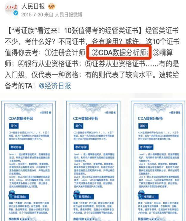 CDA数据阐发师是数据范畴承认度最高的证书,取CPA注会、CFA特许金融师齐名。遭到了、经济日报等权势巨子保举。